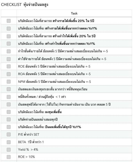 คุณ พรพรหม ภักตร์เปี่ยม จากเว็บ www.panphol.com ได้ทำ Check List หุ้นจ่ายปันผลสูง เอาไว้ เห็นว่าน่าสนใจมาก ขออนุญาตเอามาเก็บไว้สำหรับเป็นแนวทางสำหรับการลงทุนนะครับ