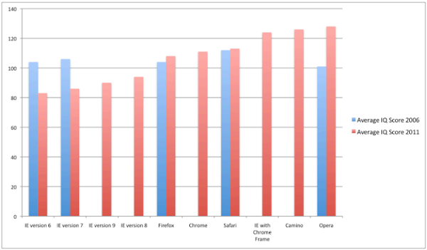 ในภาพรวมแล้วผู้ใช้ Internet Explorer มีระดับไอคิวอยู่ราว 80-90 ขณะที่กลุ่มผู้ใช้ Firefox, Chrome และ Safari มีไอคิวอยู่ในช่วง 100-110 ยิ่งไปกว่านั้นถ้าเป็นผู้ใช้งาน Chrome Frame, Camino หรือ Opera จะมีระดับไอคิวสูงมากกว่า 120 กันเลย